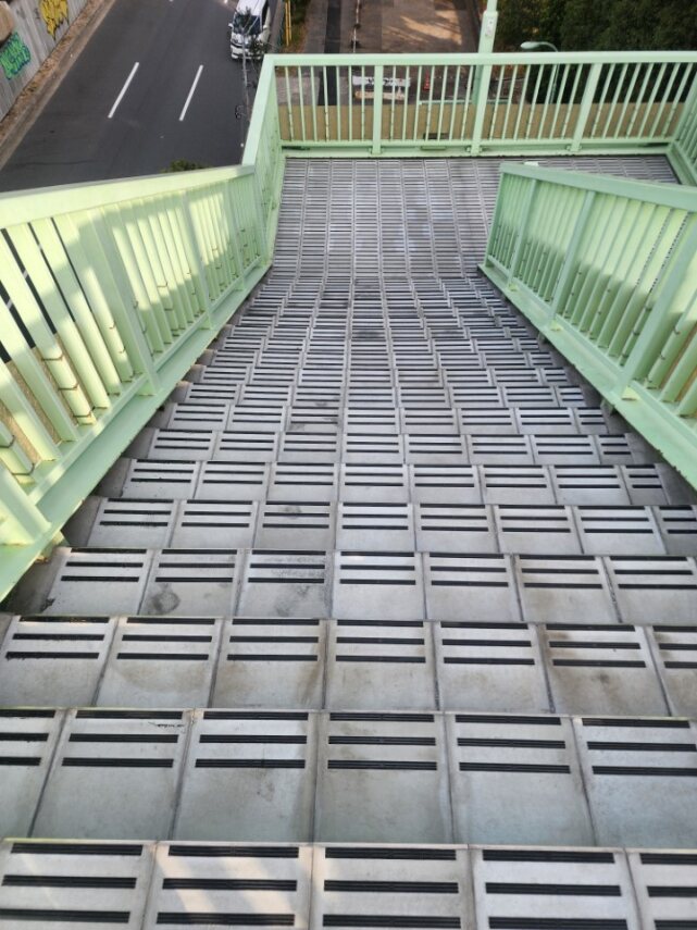 The project included the replacement of 273 m² of staircase tiles and 480 m² of thin-layer paving, reducing slip risks and enhancing pedestrian safety.